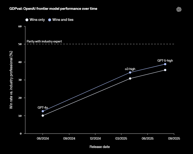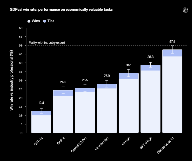 GDP (the macro number) tells us what already happened. Helpful, but late. GDPval shows what might happen to the work before it hits the economy. It moves us away from abstract puzzles and forces us to look at how AI performs on the messy, complex, and often subjective tasks that define real jobs